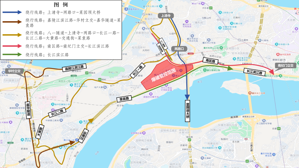 (五)跨江通行车辆建议避开菜园坝大桥及交通管制区域,优先选择黄花园大桥、重庆长江大桥等过江通道绕行。